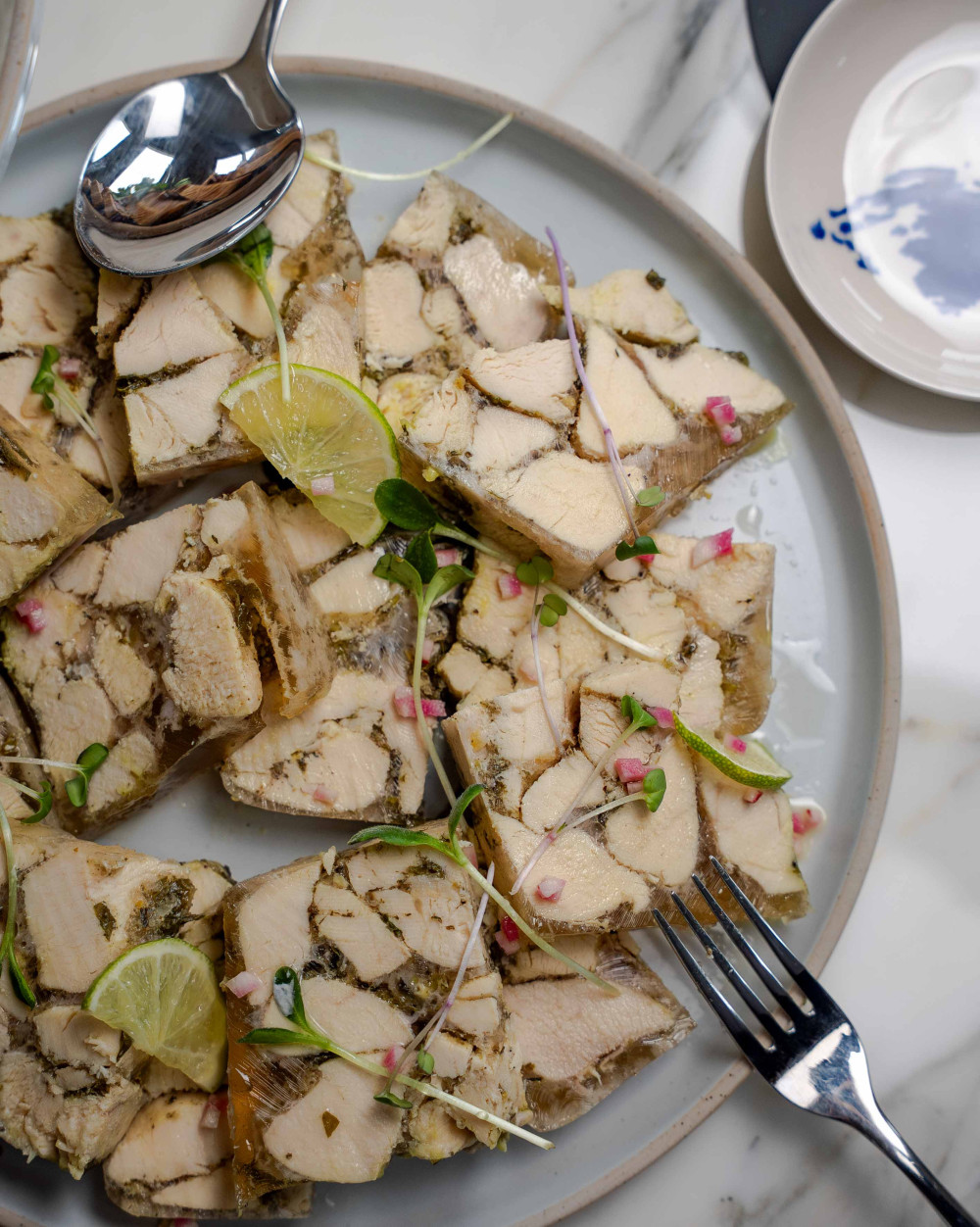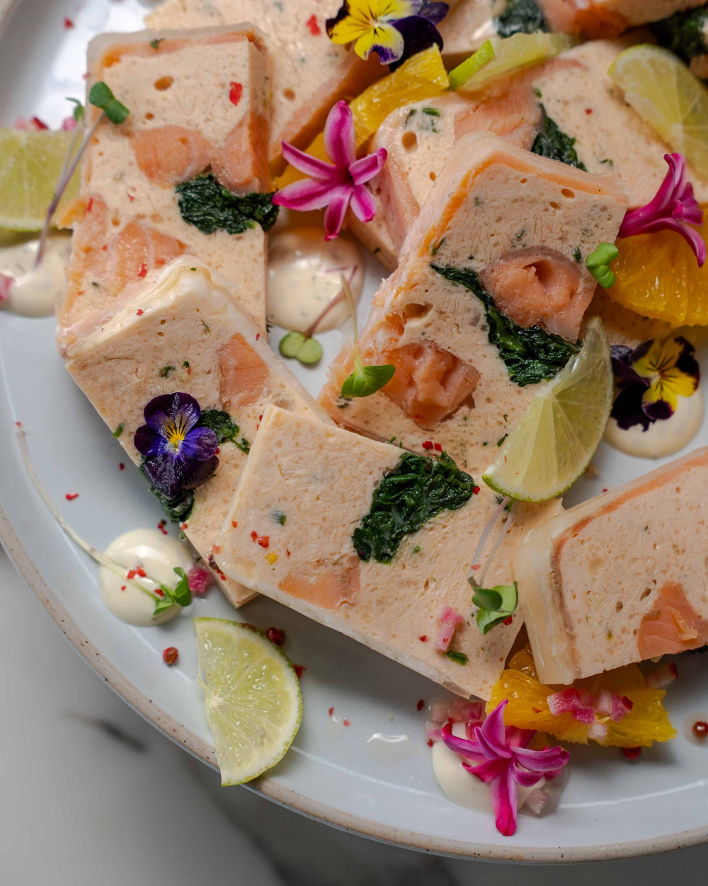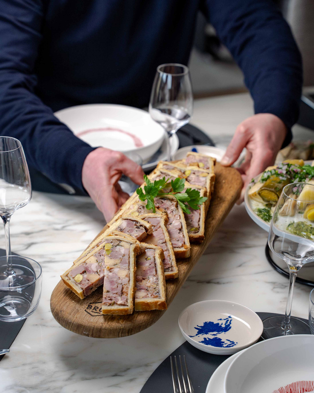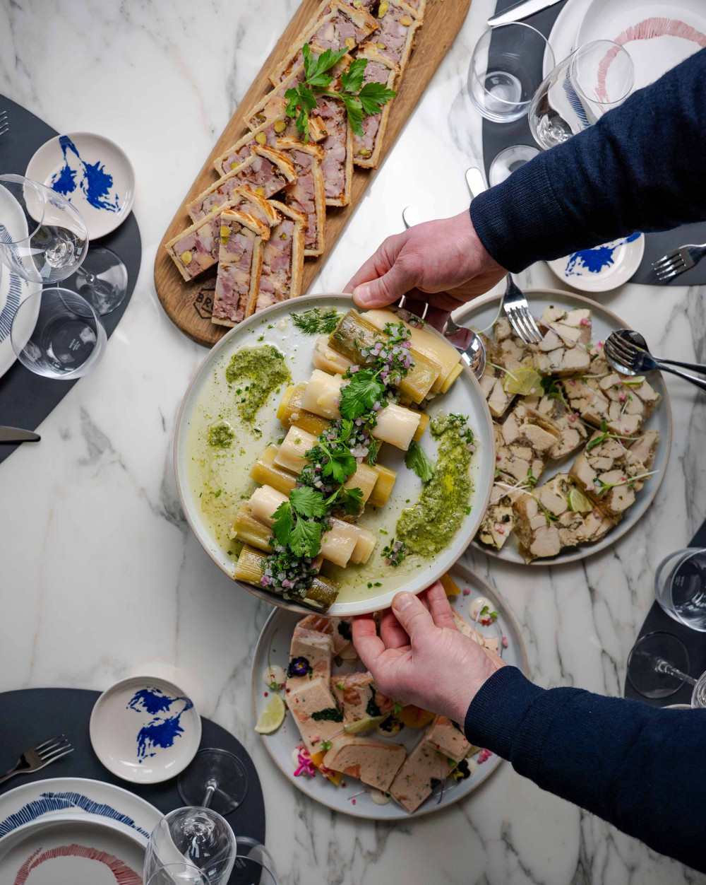 Pâté en croûte rustiqueJambon à l’os, sauce salsa verde aux herbesTerrine de poisson du moment, sauce gravlax à l’anethPressé de volaille au citron et au basilicRillettes de cochon au piment d’Espelette