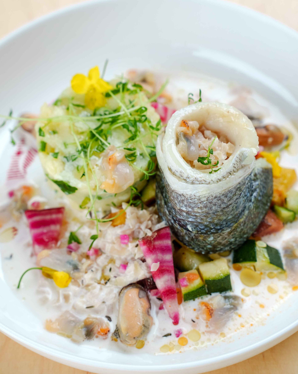 Tournedos de bar, servie avec une sauce marinière aux coquillages