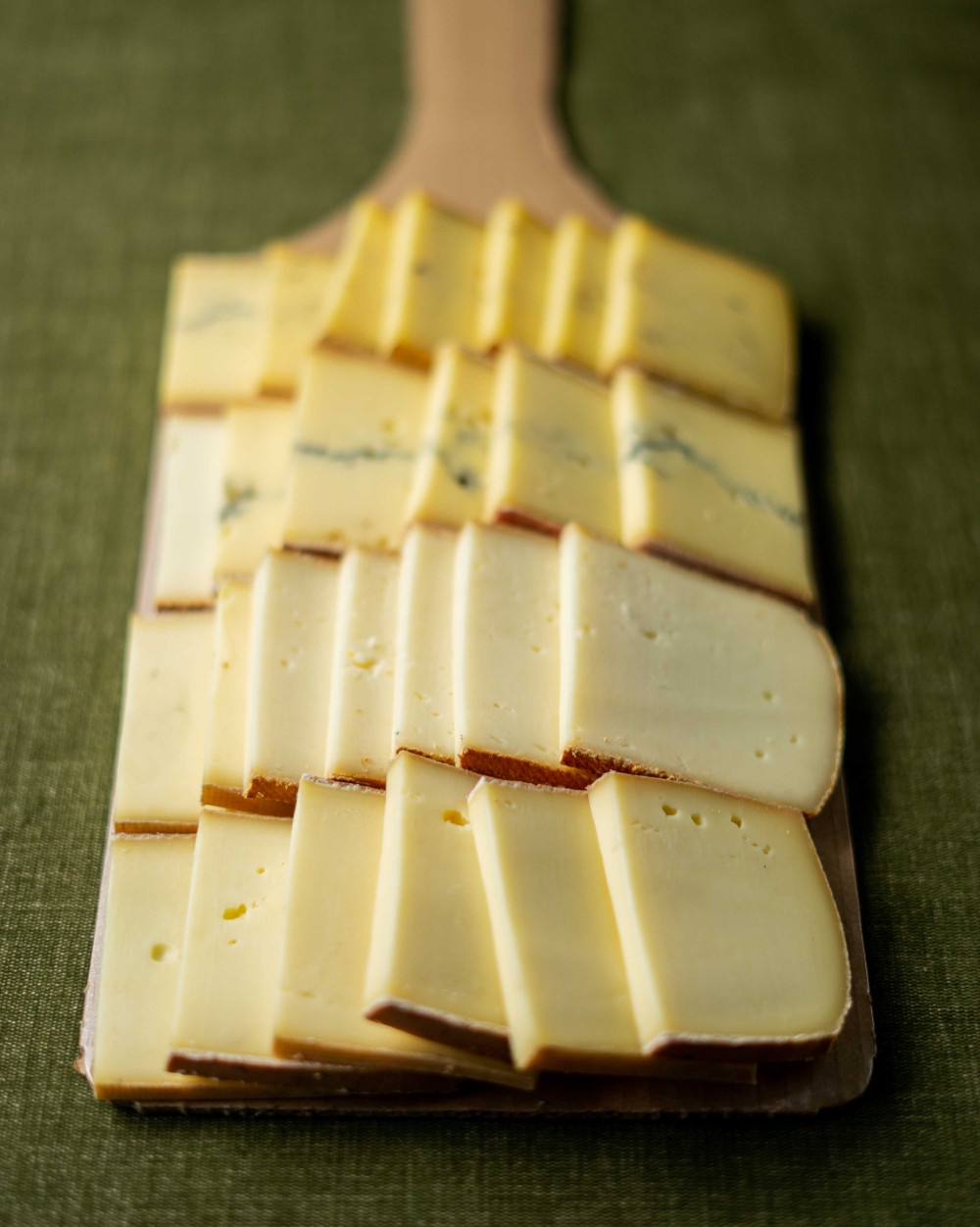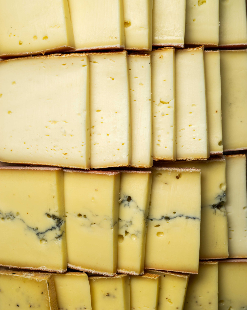 Un assortiment de raclettes francaises au Lait cru, 200g par personne (Raclette jurassic; raclette de Montbéliard au poivre; raclette de Montbéliard fumée; Morbier AOP)