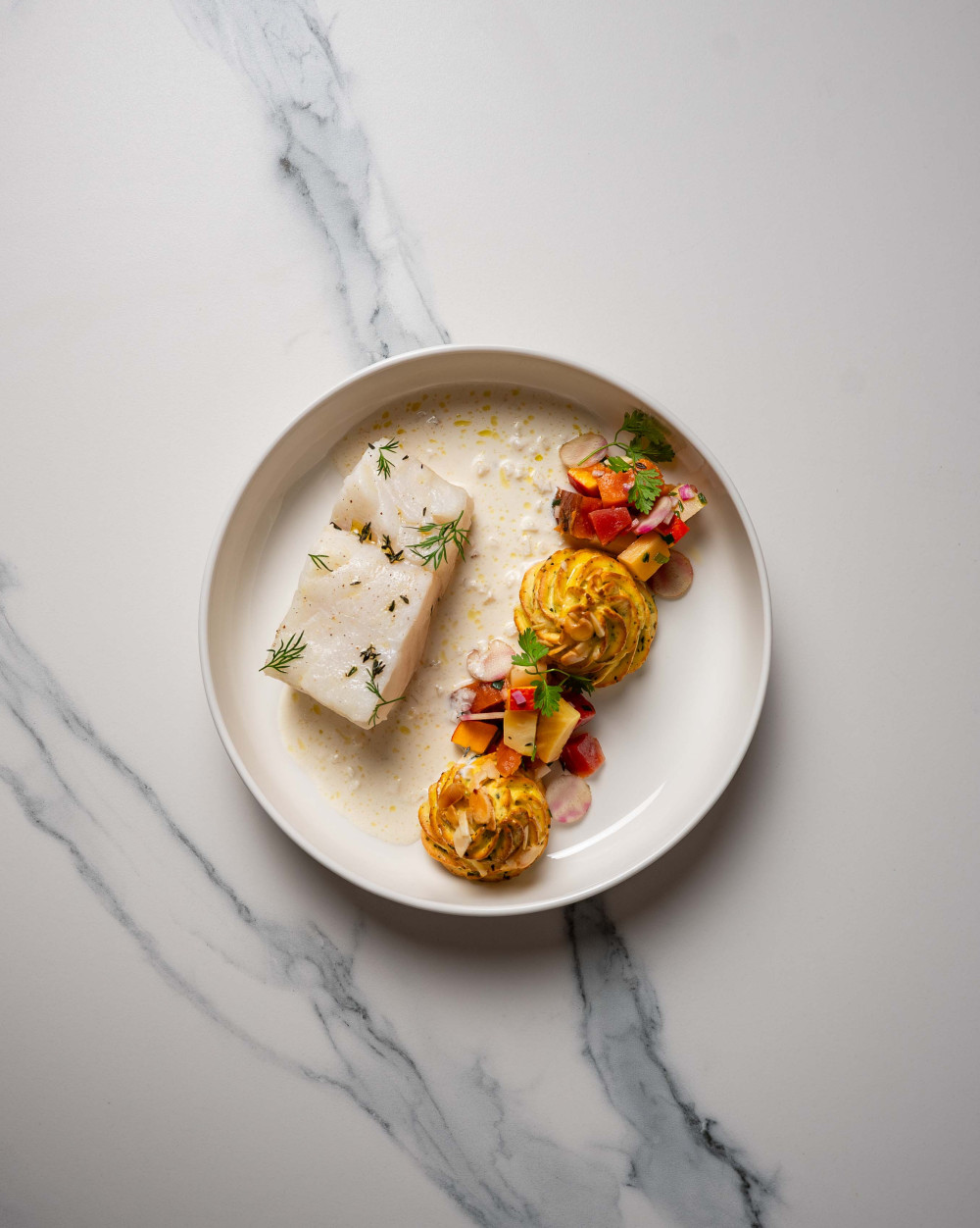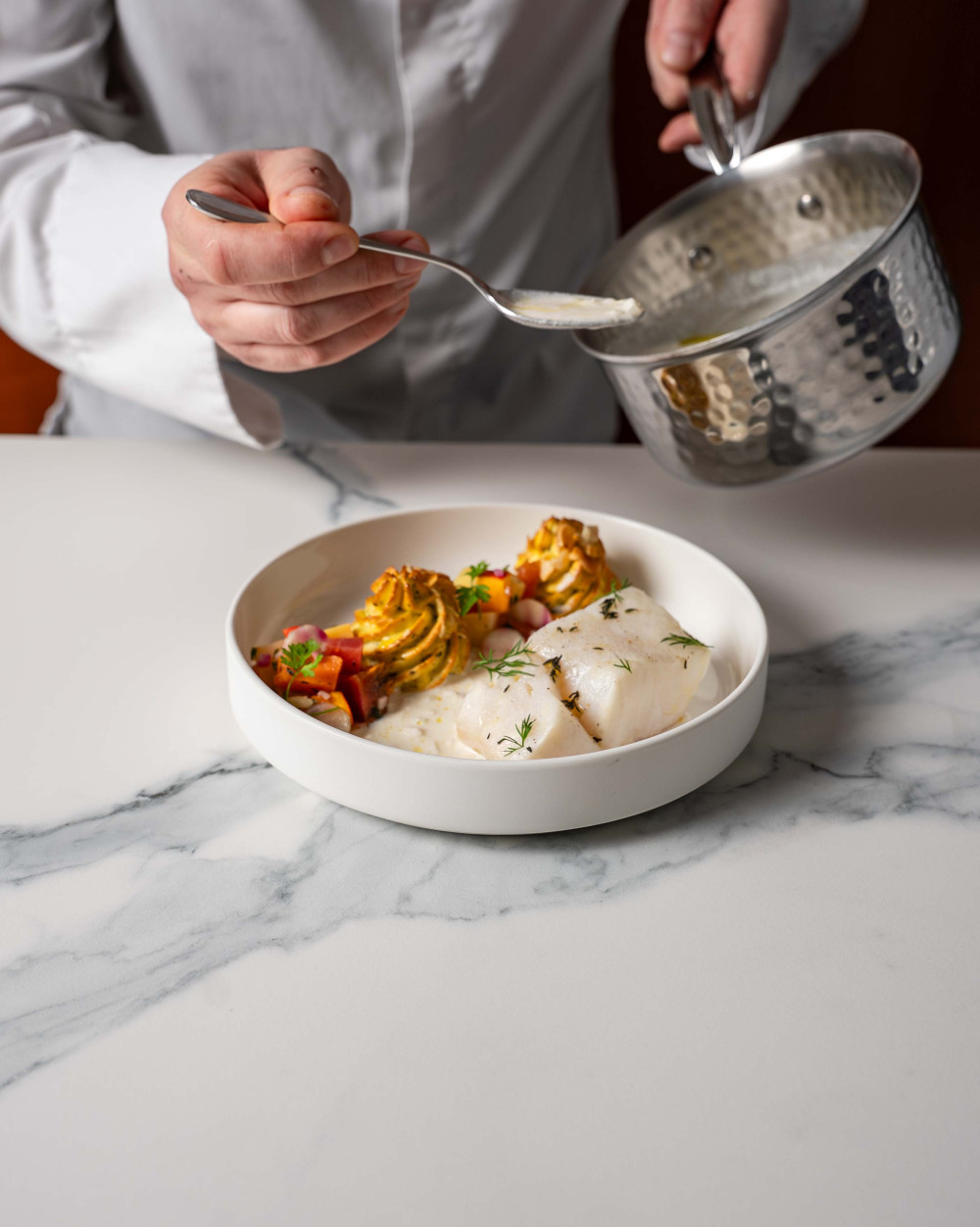 Skrei de Norvège ( Cabillaud provenant des îles Lofoten ) doré au beurre, relevé d’un beurre blanc au champagne.