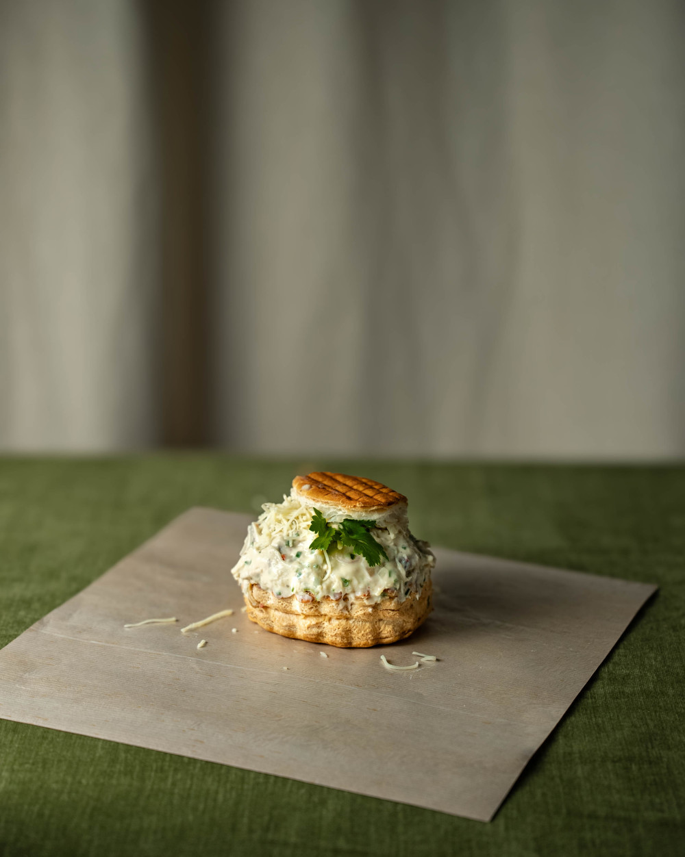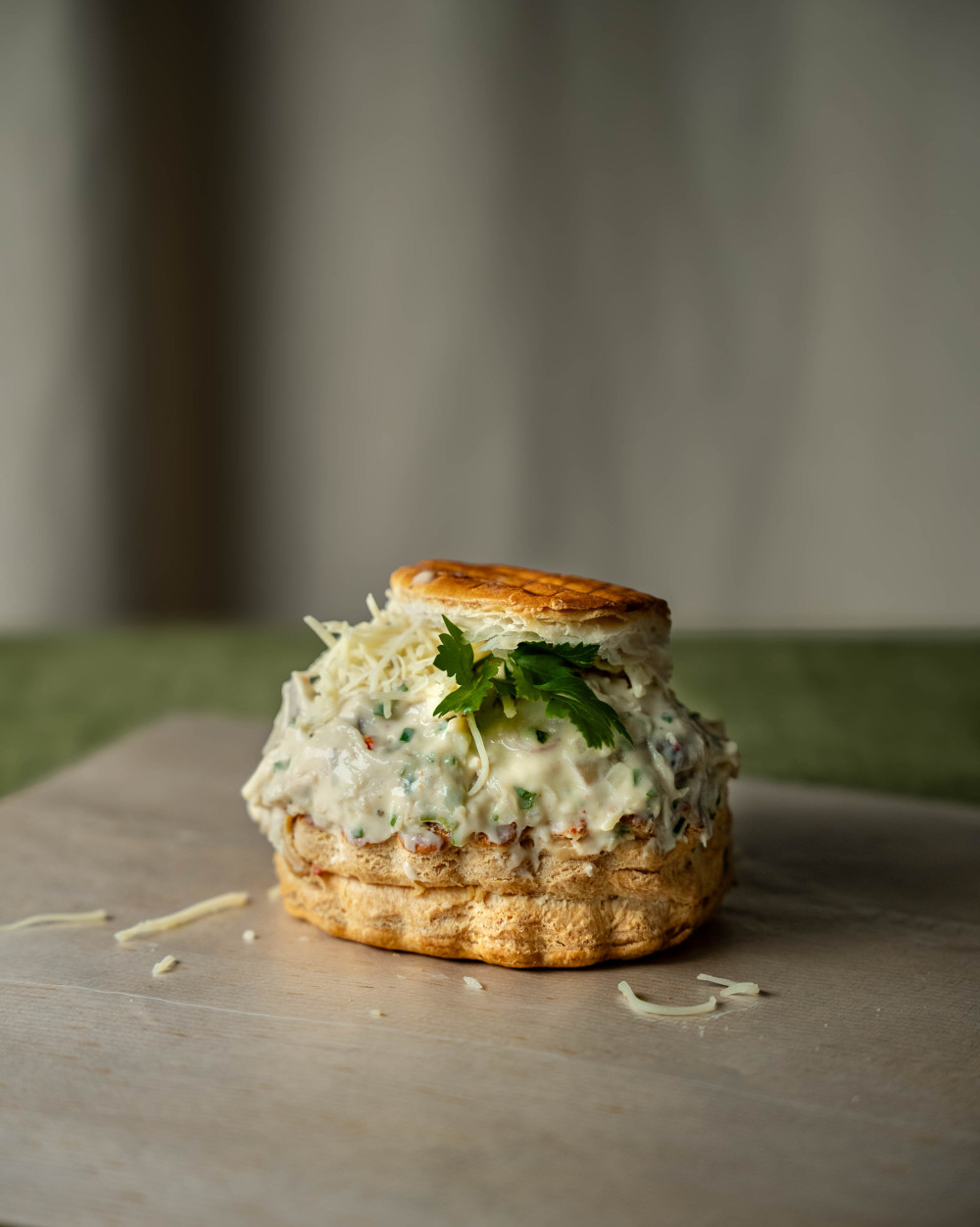 Sauce béchamel et fumet de poissons, Saint-Jacques et fruits de mer, champignons de paris et base de pâte feuilletée.